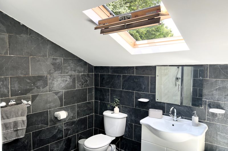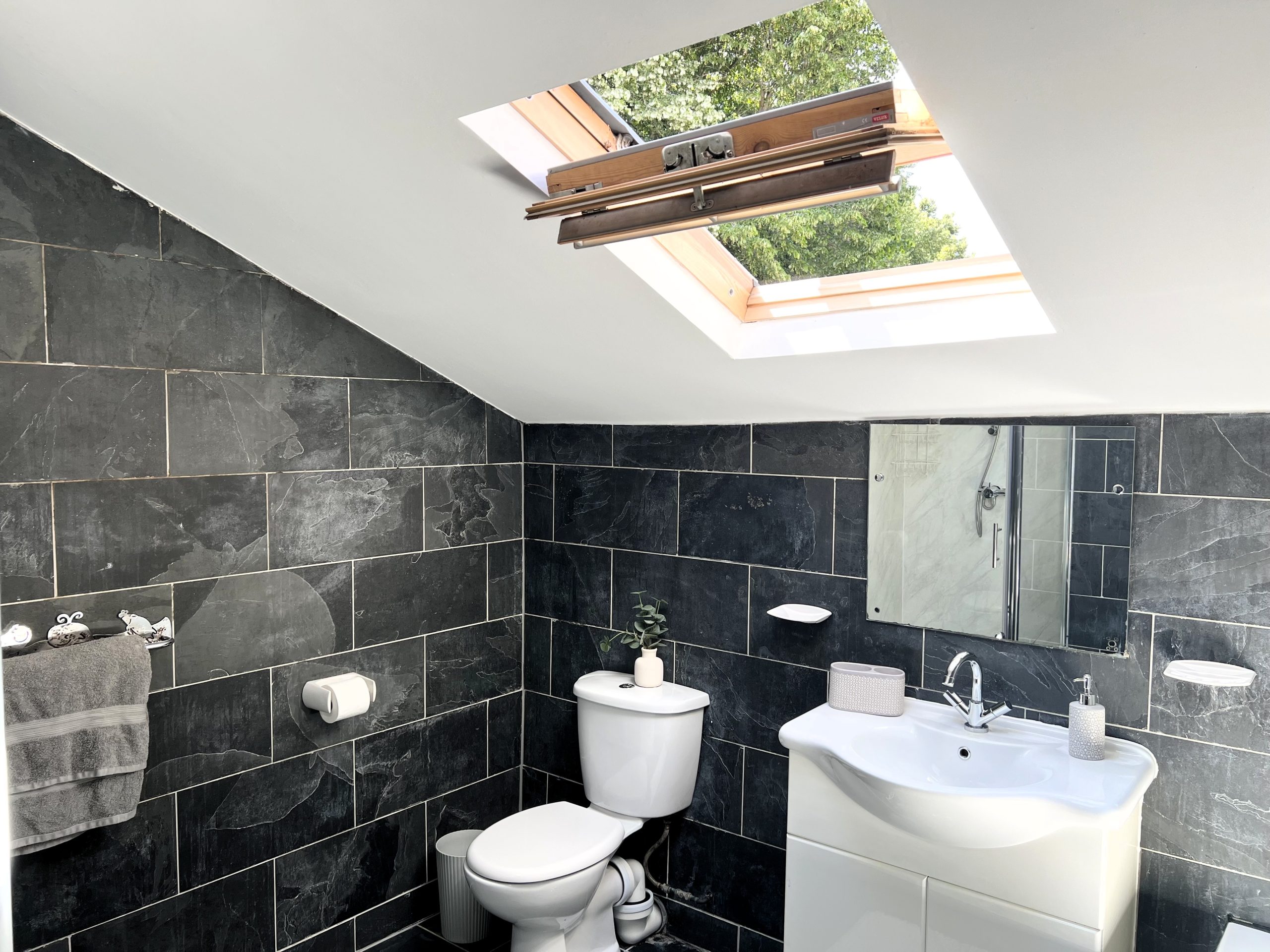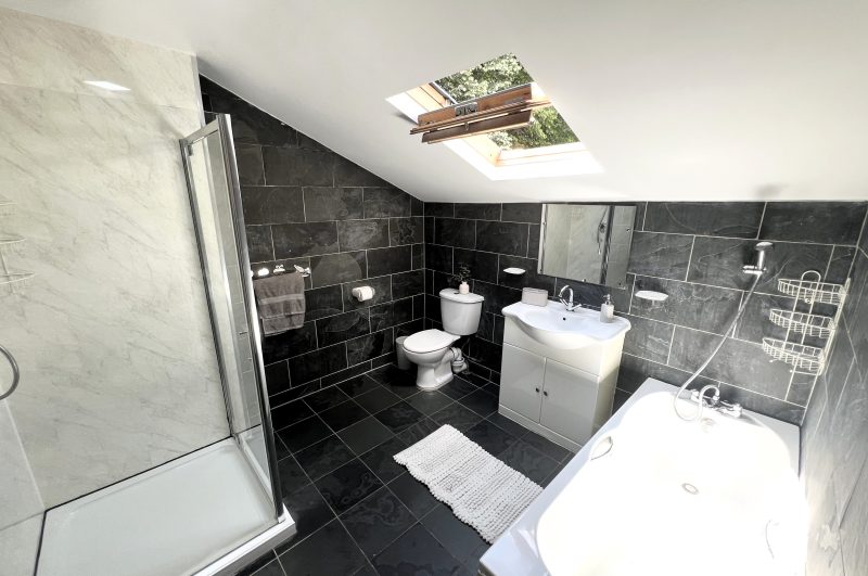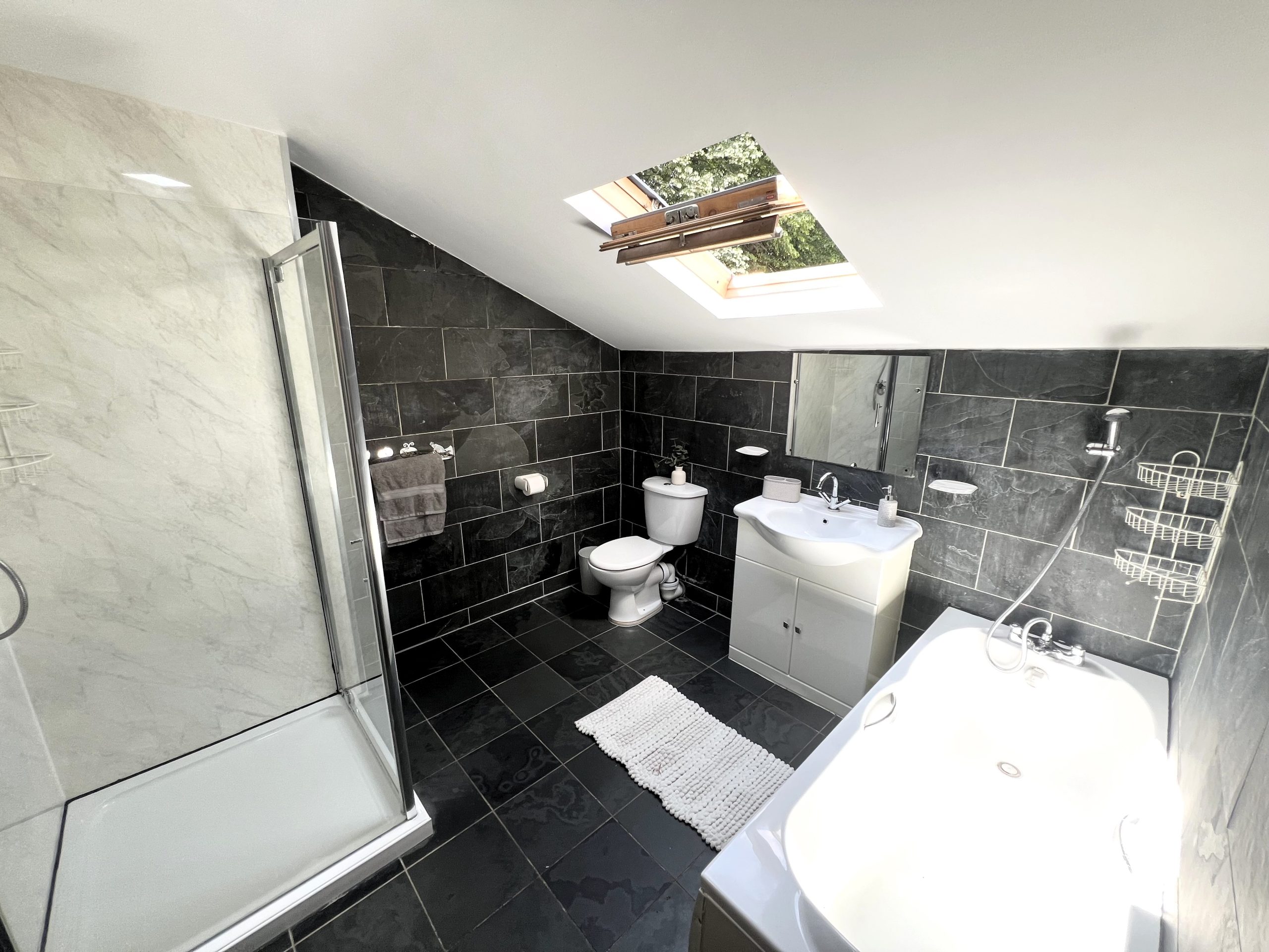 The shared bathroom is equipped with a shower cubicle and a bath.