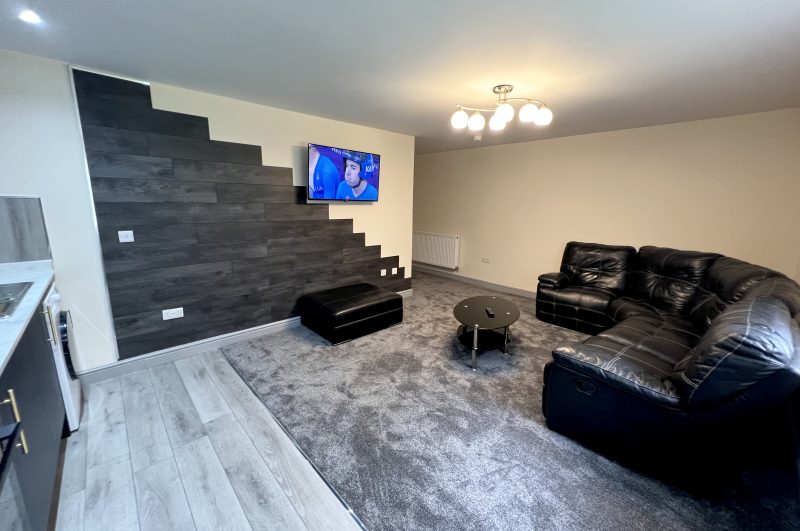 Modern open-plan kitchen/living area – sleek kitchen cabinets with marble-effect worktops, built-in oven & hob, fridge/freezer, washer/tumble dryer, microwave, and a 42-inch smart TV. Complete with stylish leather furnishings for your comfort.