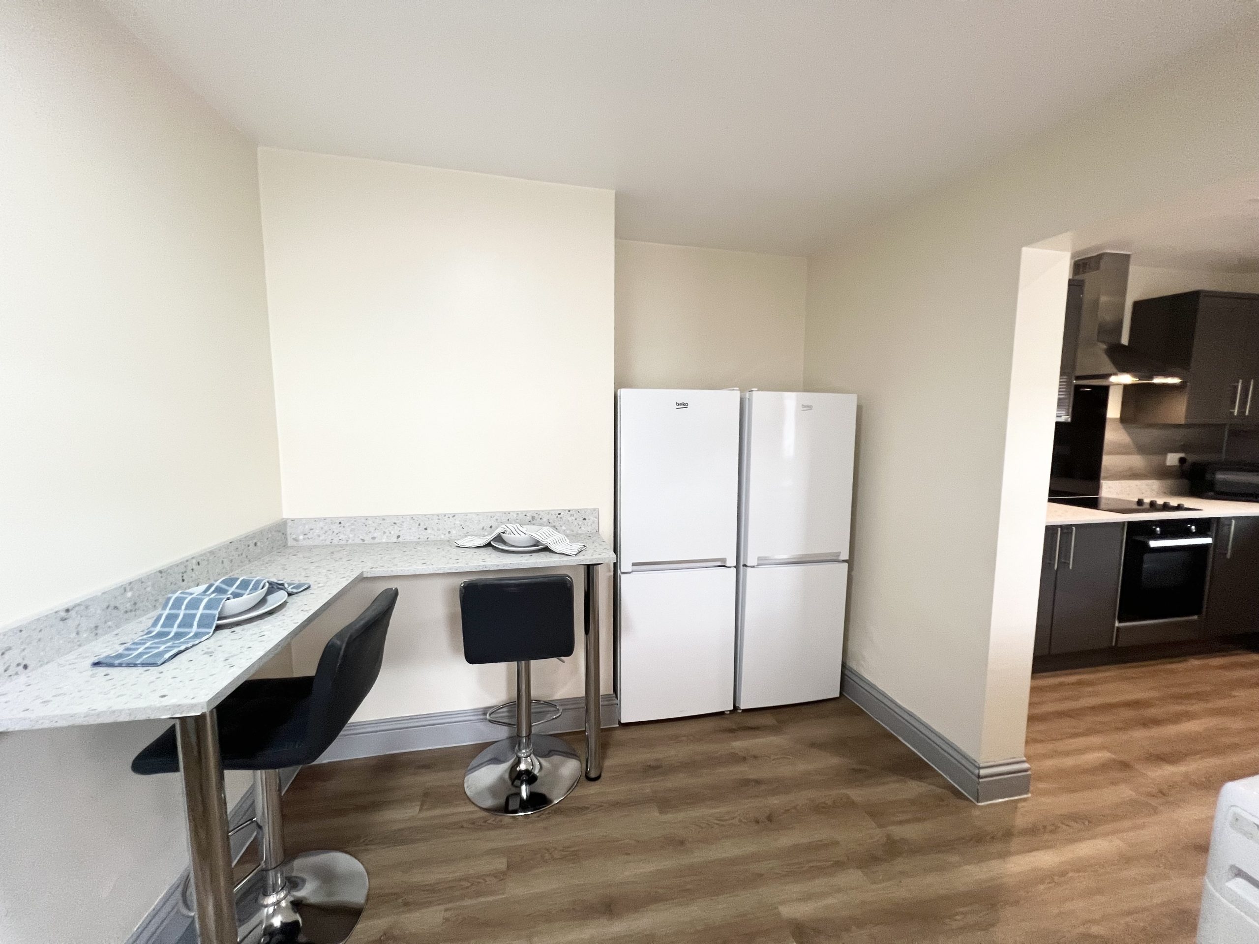 The new fully equipped kitchen boasts oven/hob, two full size fridge/freezers, dishwasher, microwave, washing machine and dryer. Additionally, there’s a separate dining area with a fitted breakfast bar and stools.