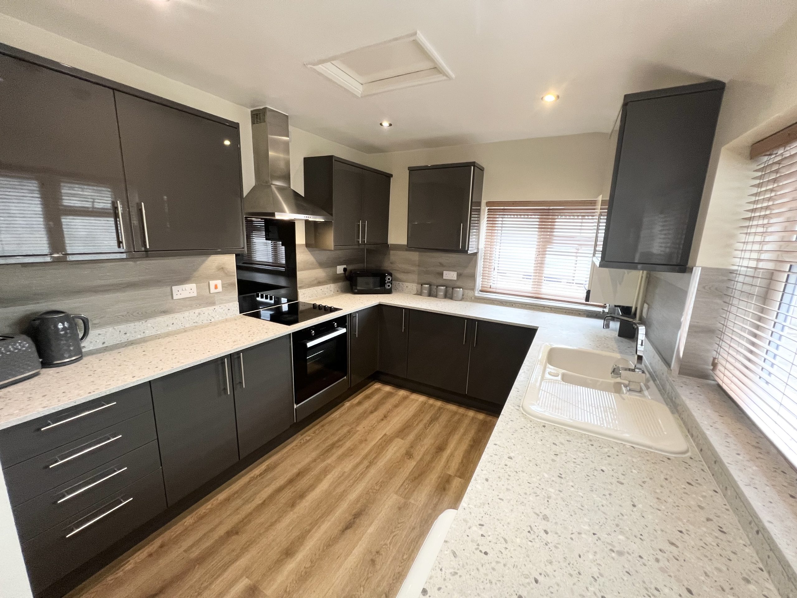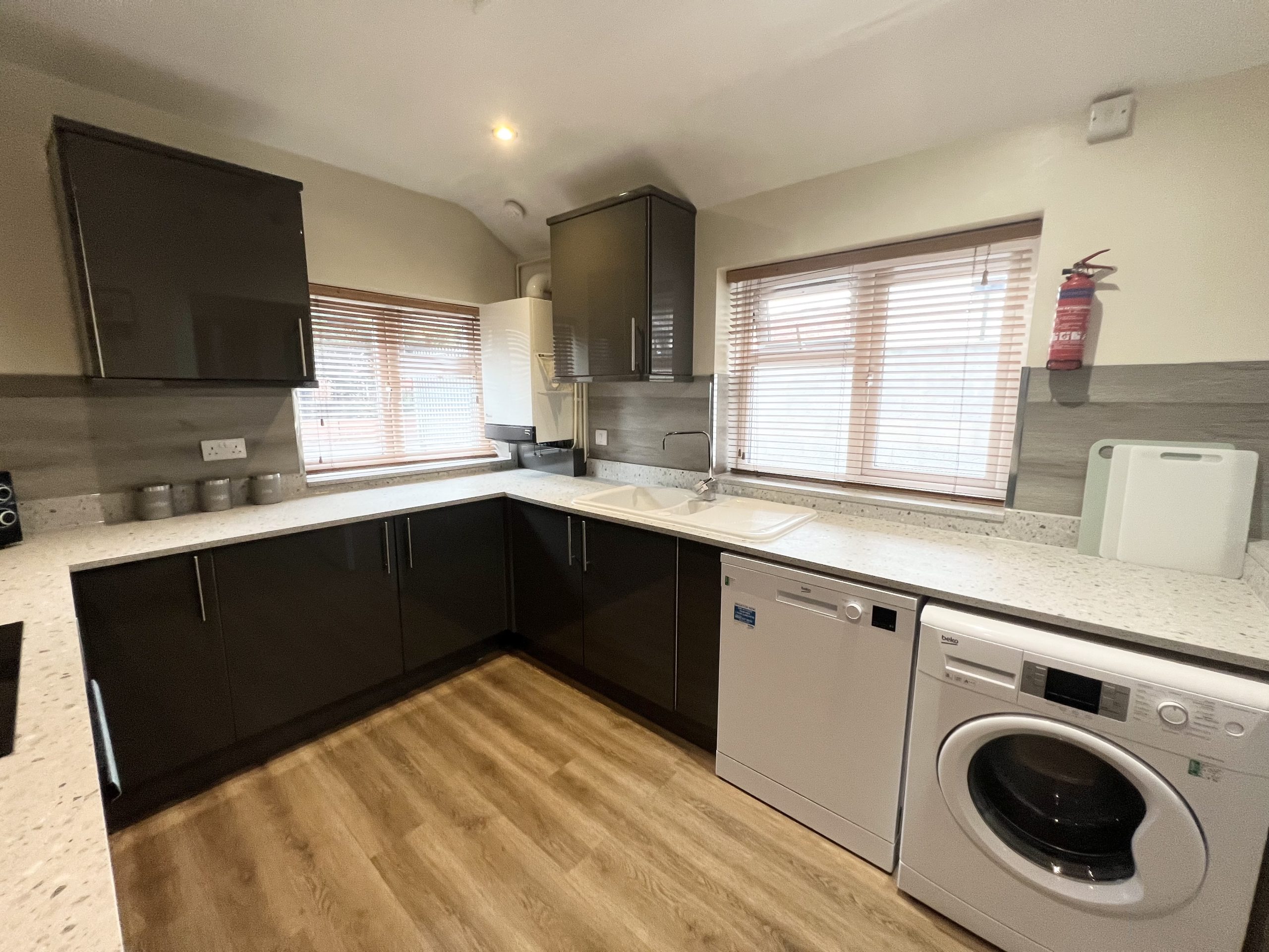 Inside, the accommodation features a spacious hallway leading to a generously sized lounge furnished with a 55” Smart TV, brand new leather sofas, and new flooring.