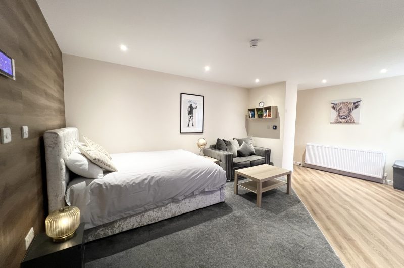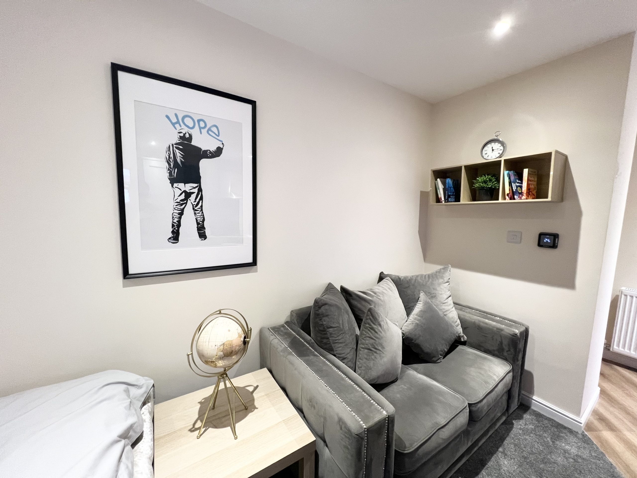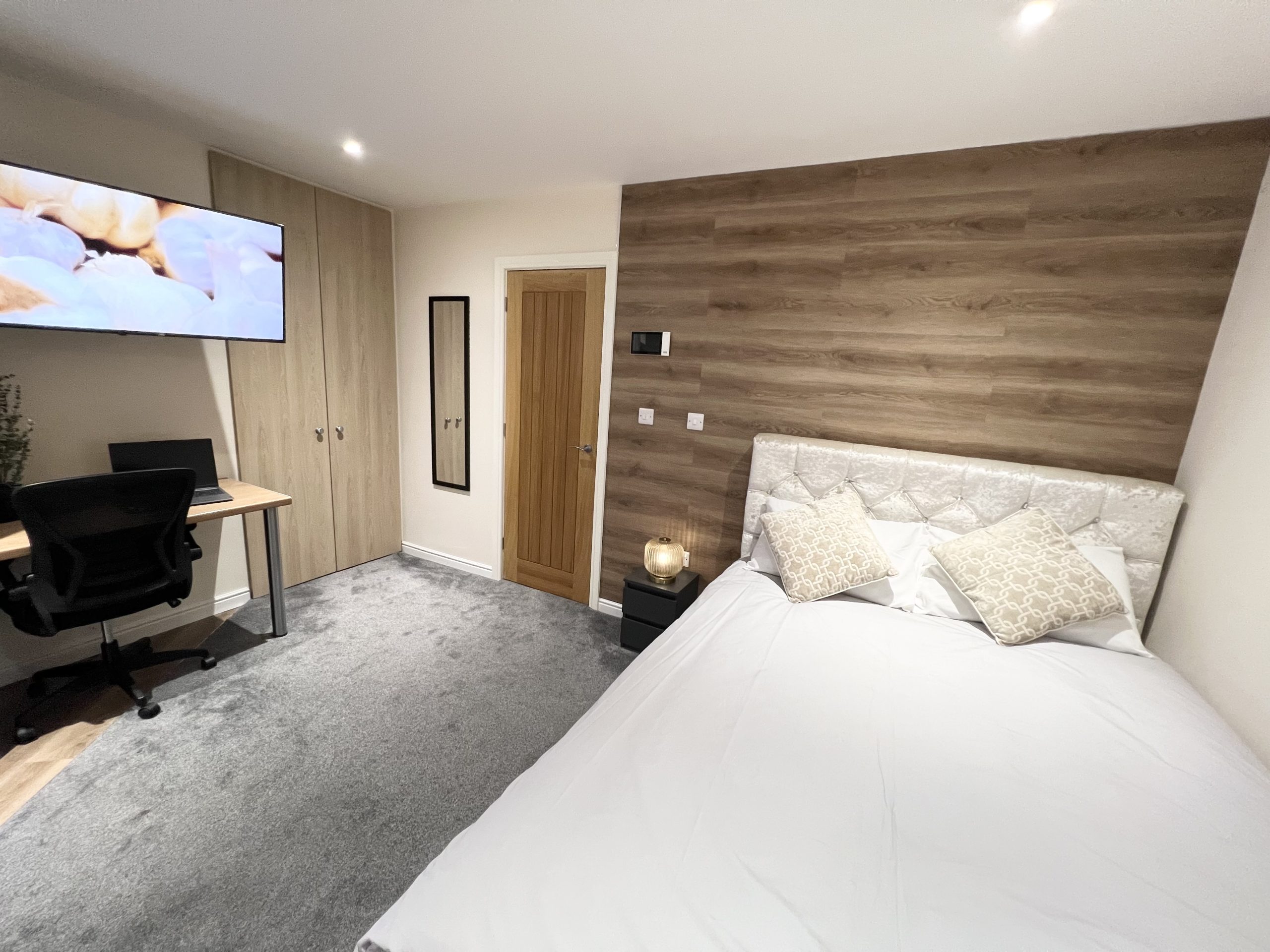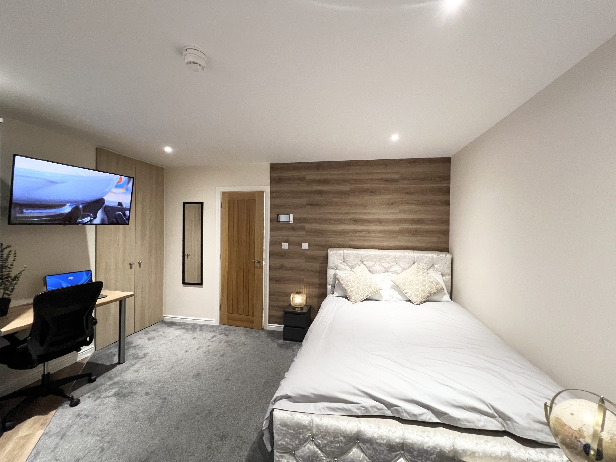 This apartment spans across a generous 30.36 sqm showcasing luxurious furnishings.Featuring a deluxe double bed complemented with a 1000 pocket memory foam mattress, a spacious built in wardrobe, two-seater embellished sofa and built in study desk and chair.The apartment boasts a well – equipped, modern shaker style kitchen with a full-size built-in oven/hob, fridge / freezer, washer / dryer and microwave.Additionally, the apartment features a fabulous hotel quality en – suite with power shower and a high gloss storage vanity basin.The property features CCTV throughout the communal corridors and enclosed outdoor area. As well as an intercom system and app controlled central heating.Ideally suited for a student couple to share or single occupancy!Contact us to arrange your viewing today, you don’t want to miss out!