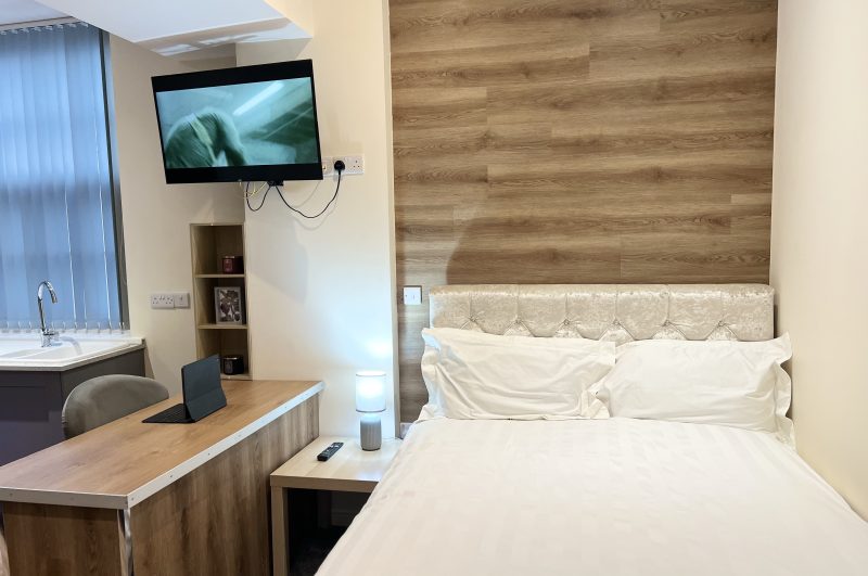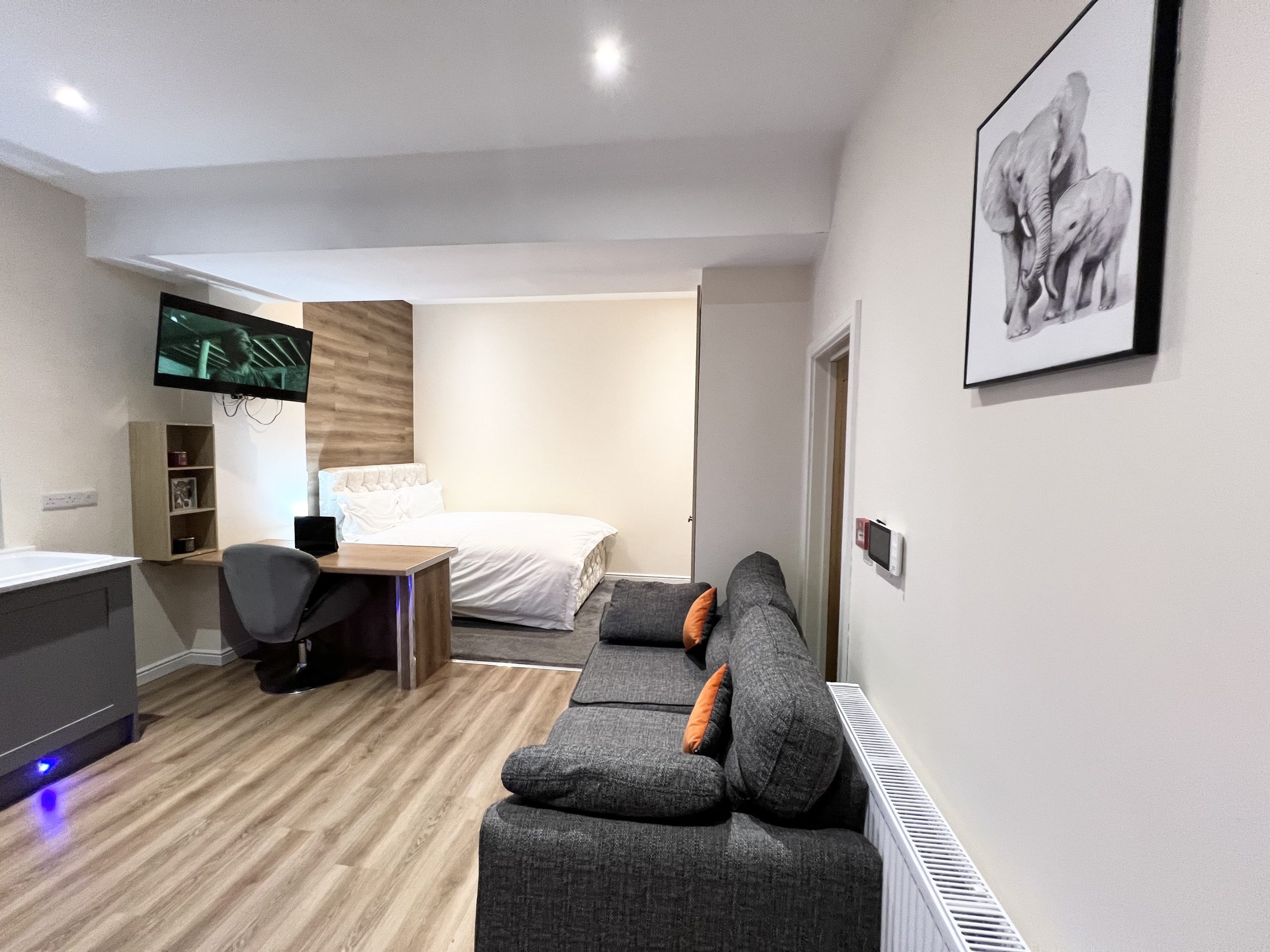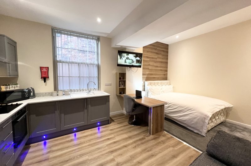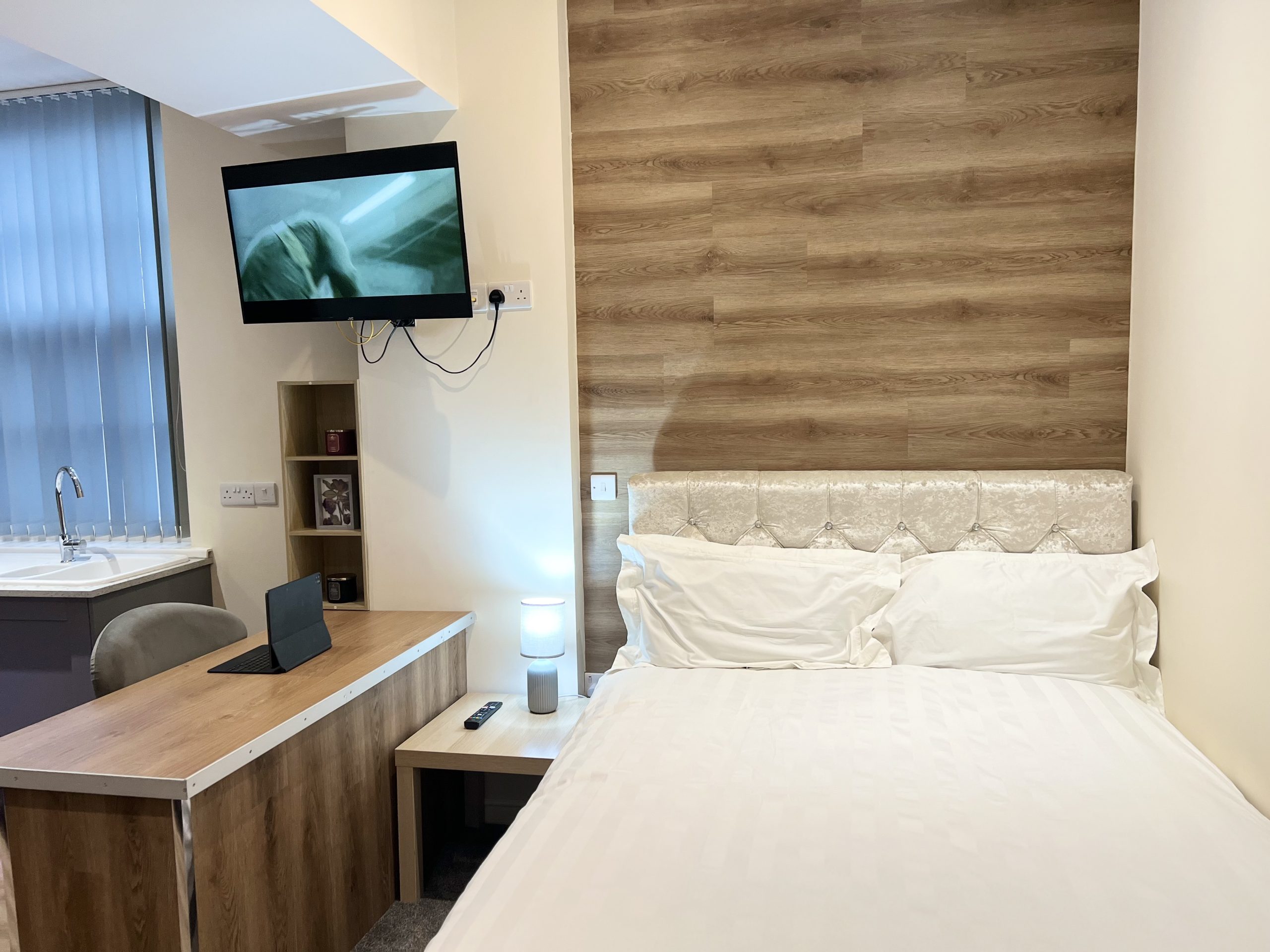 Stepping into the property you are met with the perfect blend of comfort and luxury! Fully furnished with a 43” wall mounted Smart TV, double bed complemented by a memory foam mattress, and a large built – in wardrobe.The lounge area is furnished with a comfortable two – seater sofa, coffee table, and a built in study desk and chair creating the perfect environment to study and relax!The fully fitted modern contemporary shaker style kitchen is equipped with a built in oven/hob, integrated fridge/freezer, washer/dryer, microwave and ample storage.The apartments added feature of the luxurious en – suite complete with a power shower and storage vanity basin provides maximum comfort!The properties extra amenities include double glazing, central heating controlled via a mobile app, intercom system, CCTV coverage in all communal corridors and a secure enclosed outdoor space.Ideally suited for a student couple to share or single occupancy.Don’t miss the chance to make this luxurious studio your own!For more details and to arrange a viewing please contact us on 01332 605215 or email info@randrhousing.co.uk
